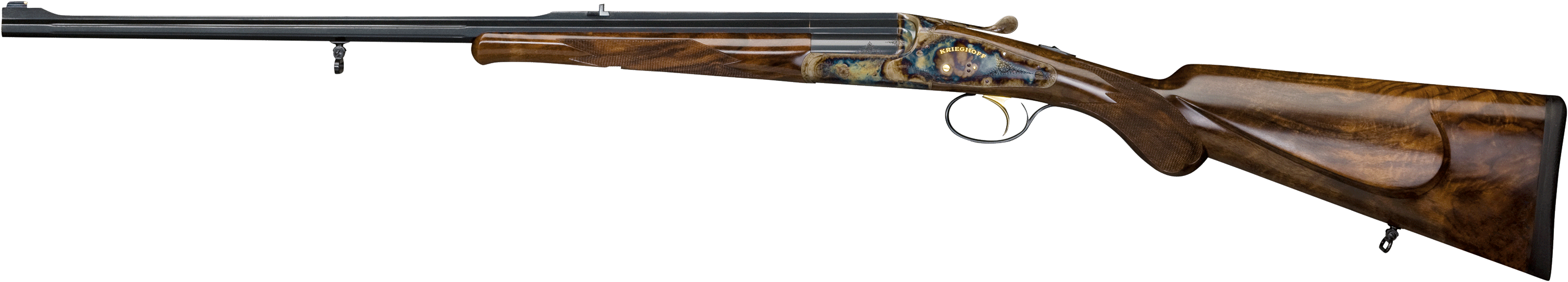 Krieghoff presents a masterpiece of precision an elegance with its Essencia line. Perfectly matched to the dangerous game hunt in the model "Big Five", the characteristic side locks offer excellent persistence, constant trigger characteristics and highest safety features. The genuine back action sidelocks have all internal parts and triggers gold plated, while the color-case hardened receiver is engraved with English scrolls. The elegant round body action and the Holland & Holland style ejectors ensure responsiveness and easy handling. The Essencia is also available as side-by-side shotgun or single shot rifle.